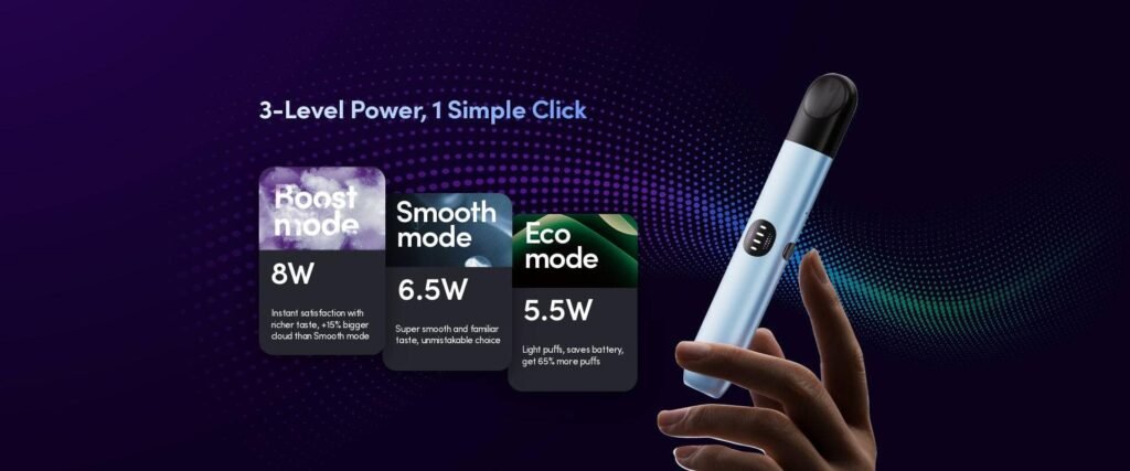 RELX悅刻六代主機提供三段調壓設計,讓您根據喜好跟需求選擇最合適的霧化設定。低檔位適合追求柔和口感的使用者,中檔位則平衡口感與煙霧量,而高檔位針對喜歡強烈霧化體驗的人群。調壓操作簡單直觀,只需幾秒即可調整到您想要的檔位,真正做到個性化使用。